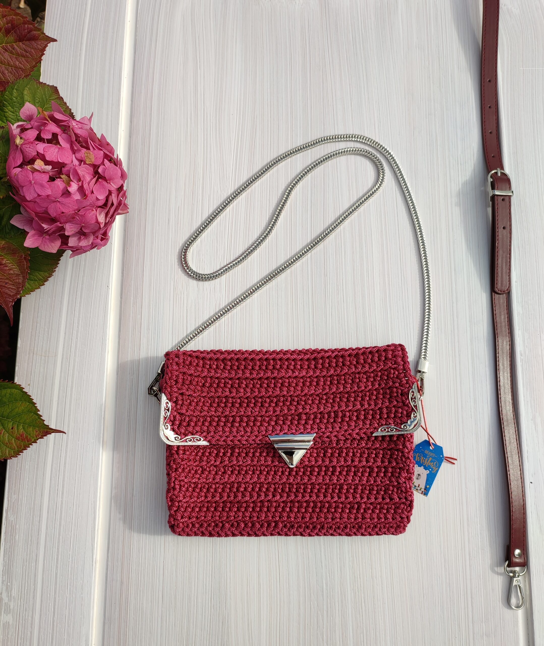 Crafted with love and attention to detail, this bag is truly a work of art. The beautiful crochet pattern creates a charming texture, adding a touch of elegance to any outfit. Its detachable handle allows you to customize your look effortlessly. Wear this bag with a leather strap or a classic silver chain, or remove the handle and use it as a clutch.