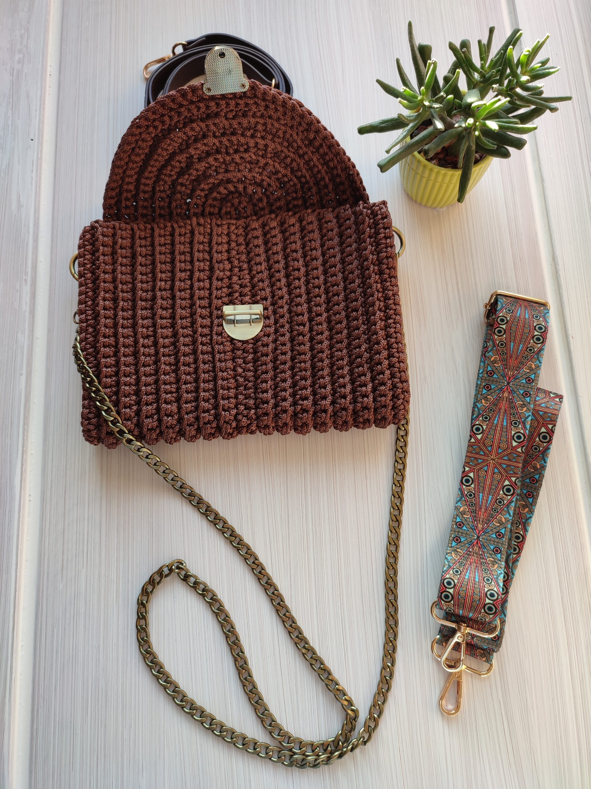 Crafted with love and attention to detail, this bag is truly unique and a work of art. The beautiful crochet pattern creates a charming texture, adding a touch of elegance to any outfit. Comes with two detachable straps (cross-body strap and chain). With a variety of straps, you can easily personalize your look. Opt for a classic bronze chain or brown textile strap, faux leather strap, or remove the strap and use this bag as a clutch. Practical and Stylish: This bag combines style with functionality, its compact size is perfect for carrying your essentials, such as your phone, wallet, keys, makeup and other. Exceptional quality. Crafted from polyester cord, this bag is durable and sturdy. You can trust it to withstand the test of time!