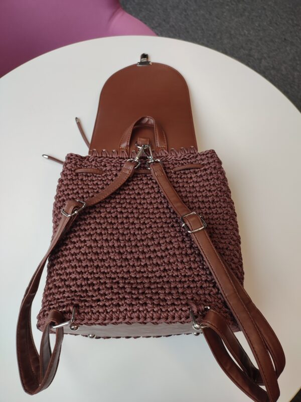 Crafted with love and attention to detail, this backpack is truly unique. The beautiful crochet pattern creates a charming texture, adding a touch of elegance to any outfit. This backpack has a metal clasp closure, leather drawstring and internal keyring and pocket with magnet button for your convenience and comfort.